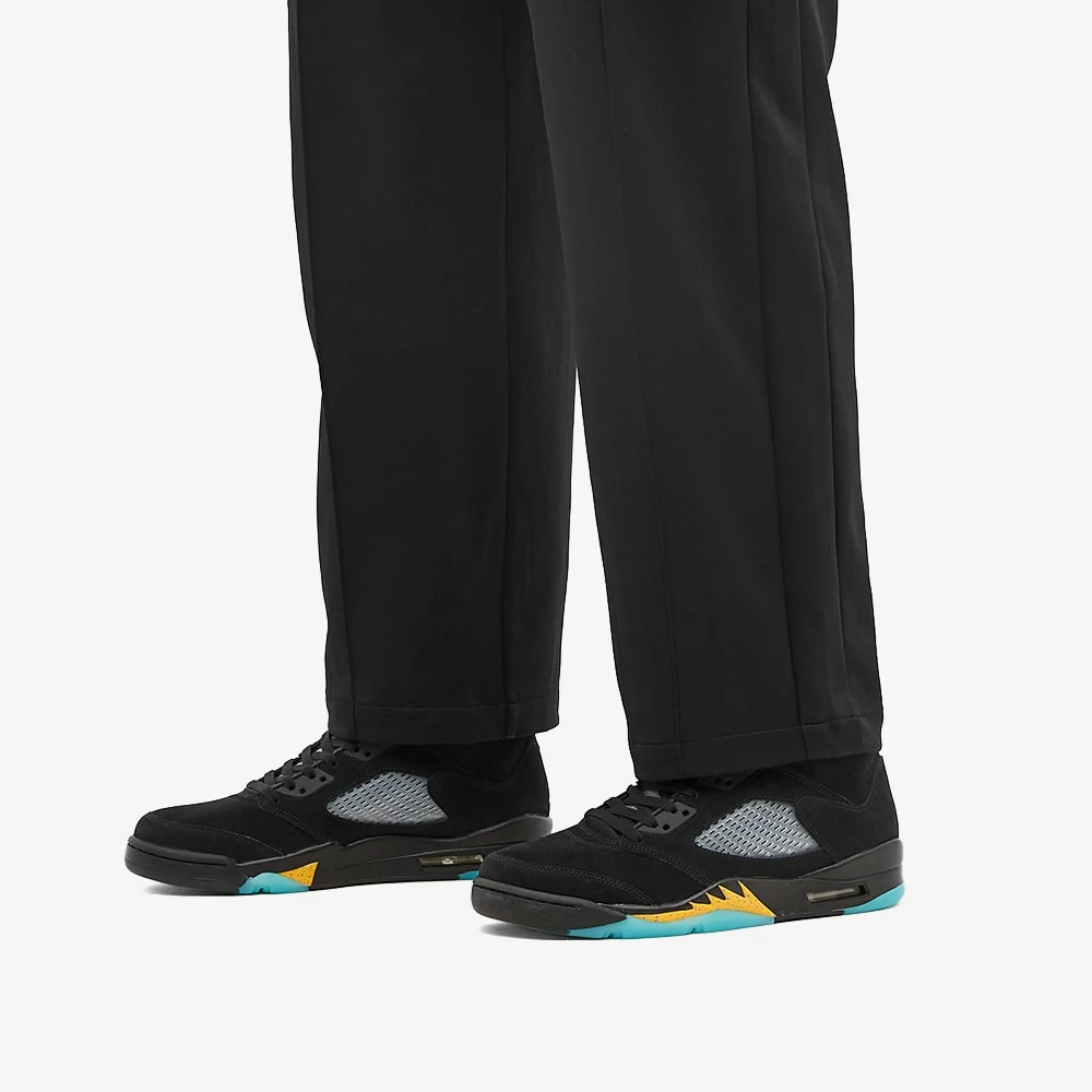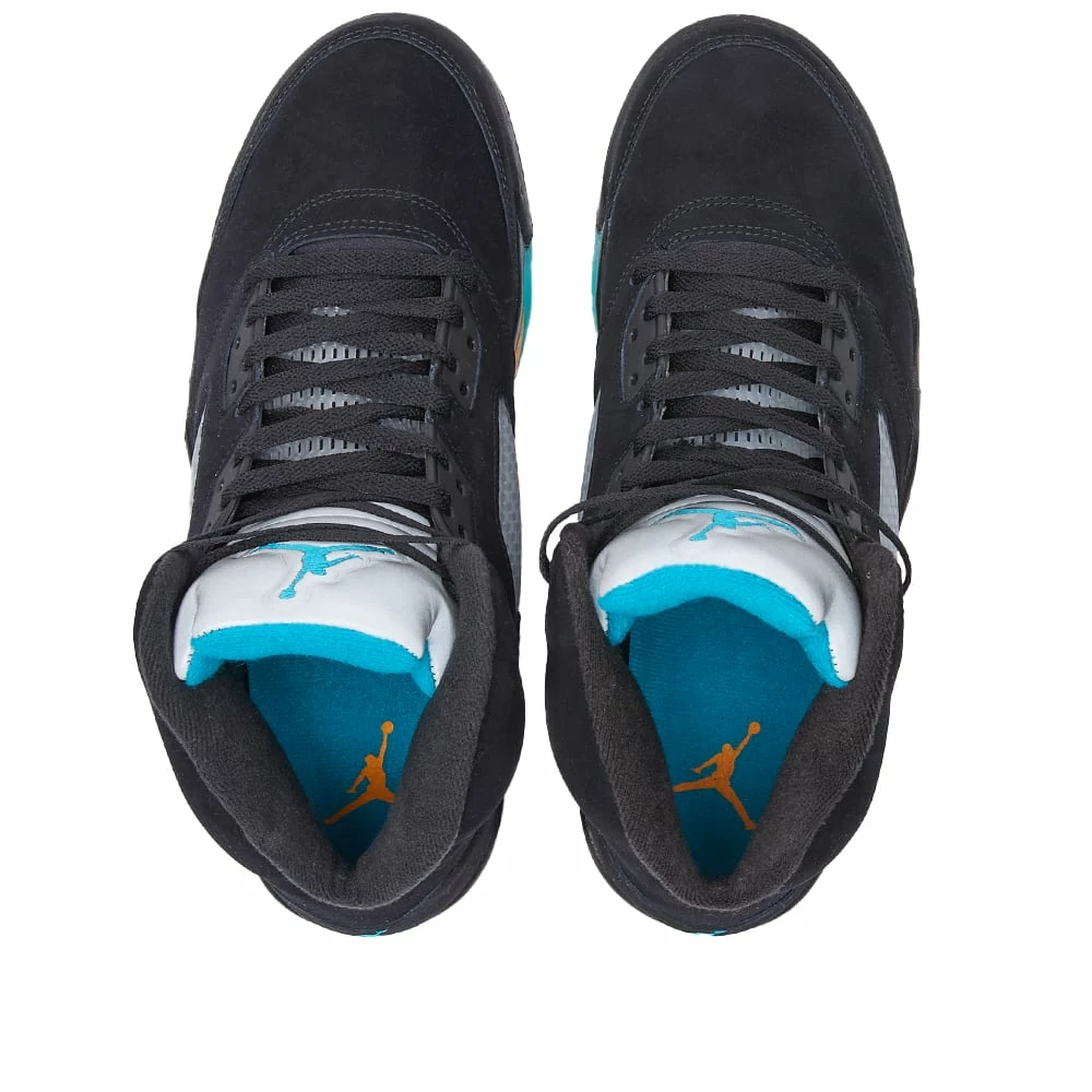 Air Jordan continues with the tradition of using bold and new colourways to up-level classic styles. The Aqua 5 Retro sneaker is an unofficial homage to Chris Paul’s exclusives with the leather uppers and solid black backdrops. Made to a chunky hi-top style with suede overlays, the sneakers are made with a thick ankle collar to support your foot during movement. The shoe’s Aqua colourway is featured on the trim of the tongue and the electric blue rubber outsole which snakes up the side of the sneaker to look like water in motion. The brand’s iconic Jumpman logo features both on the tongue and on the back of the sneaker in the new Aqua blue.