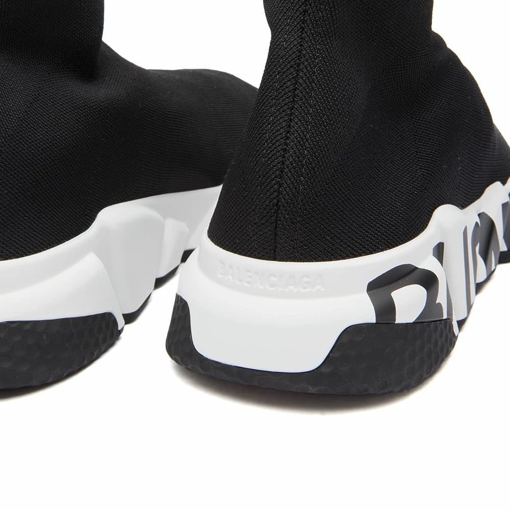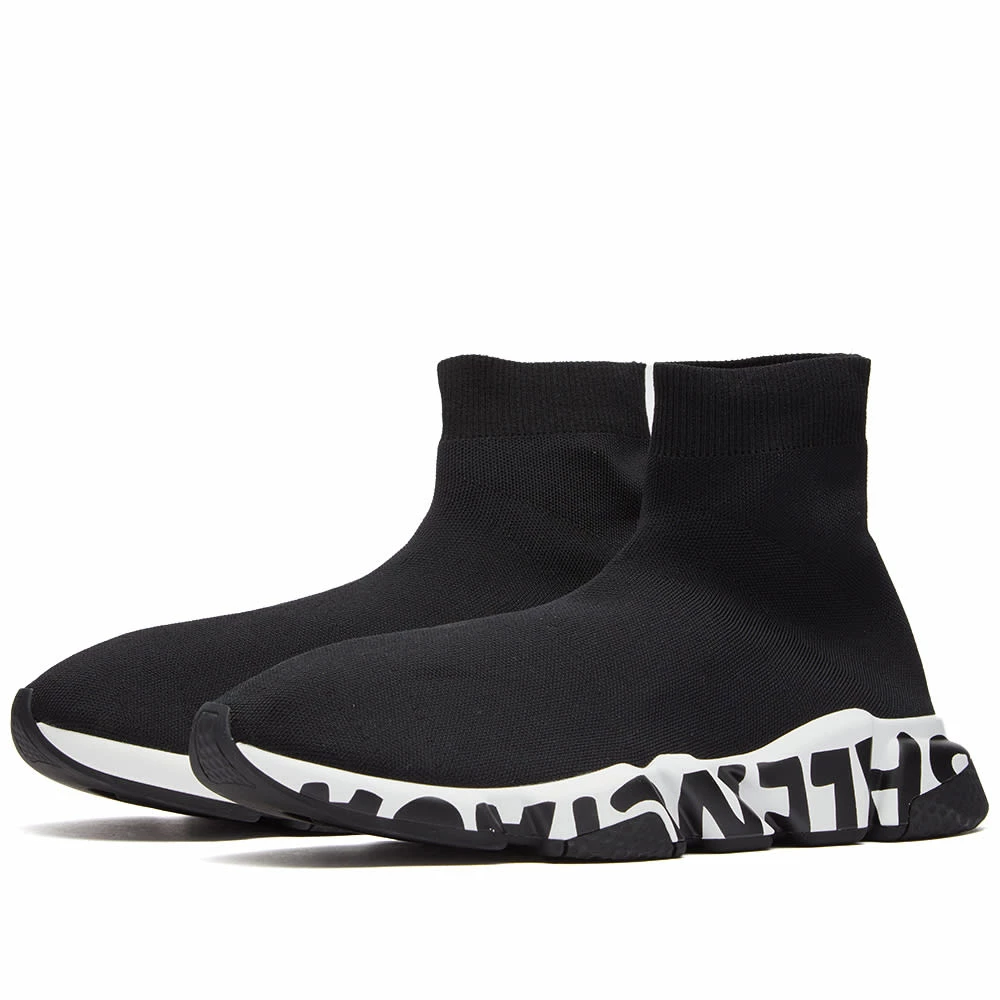 The instantly-recognisable Balenciaga Speed runners get a fresh update with this graffitied pair. Coloured in slick black, they retain their ‘nearly barefoot’ sock-like construction, while the usual ‘no memory’, white chunky soles are decorated with black graffiti style branding along the side.