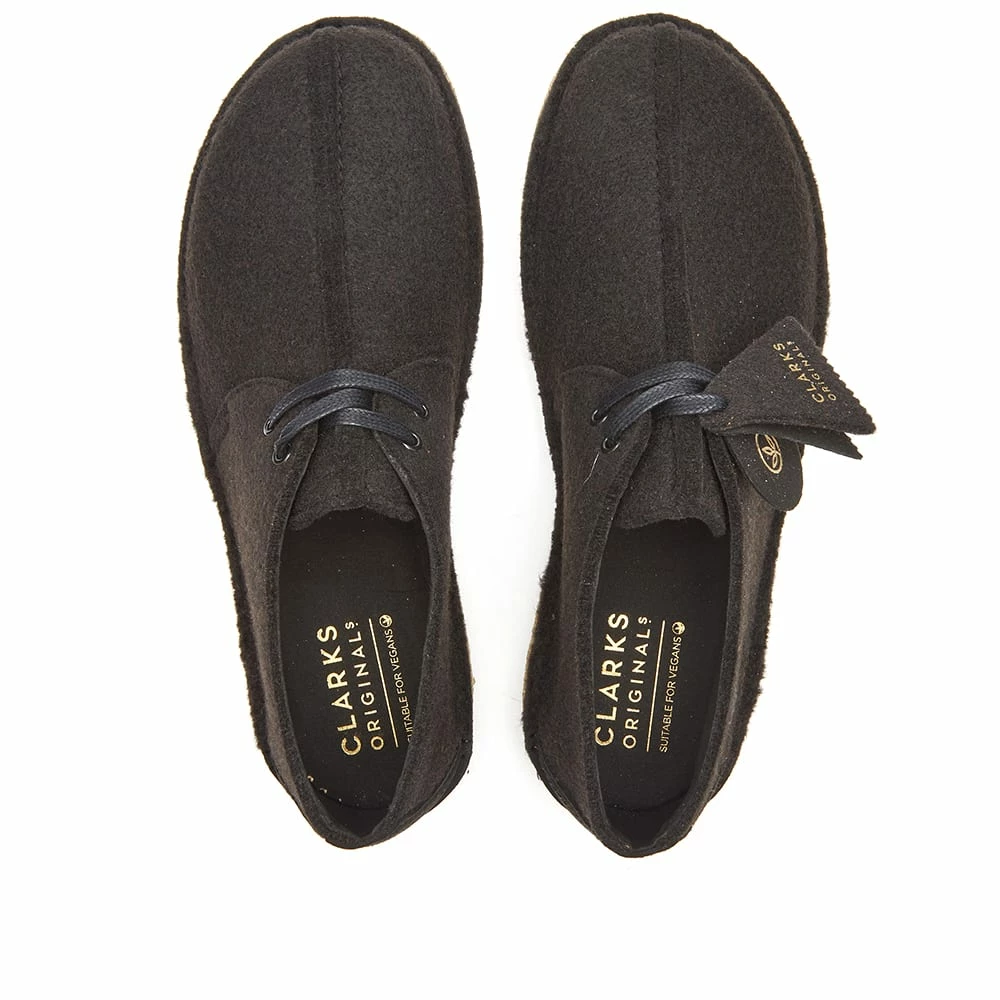 As part of its effort to produce sustainable favourites, Clarks offers a vegan-friendly update of its iconic Desert Trek shoe. Crafted from plush black felt, made from recycled bottles, they’re joined as usual by the signature centre seam while underfoot is the all-familiar crepe outsole. Standing as always – at the fob and heel – with his backpack and hiking pole, the Trek Man motif rounds off the rugged look.