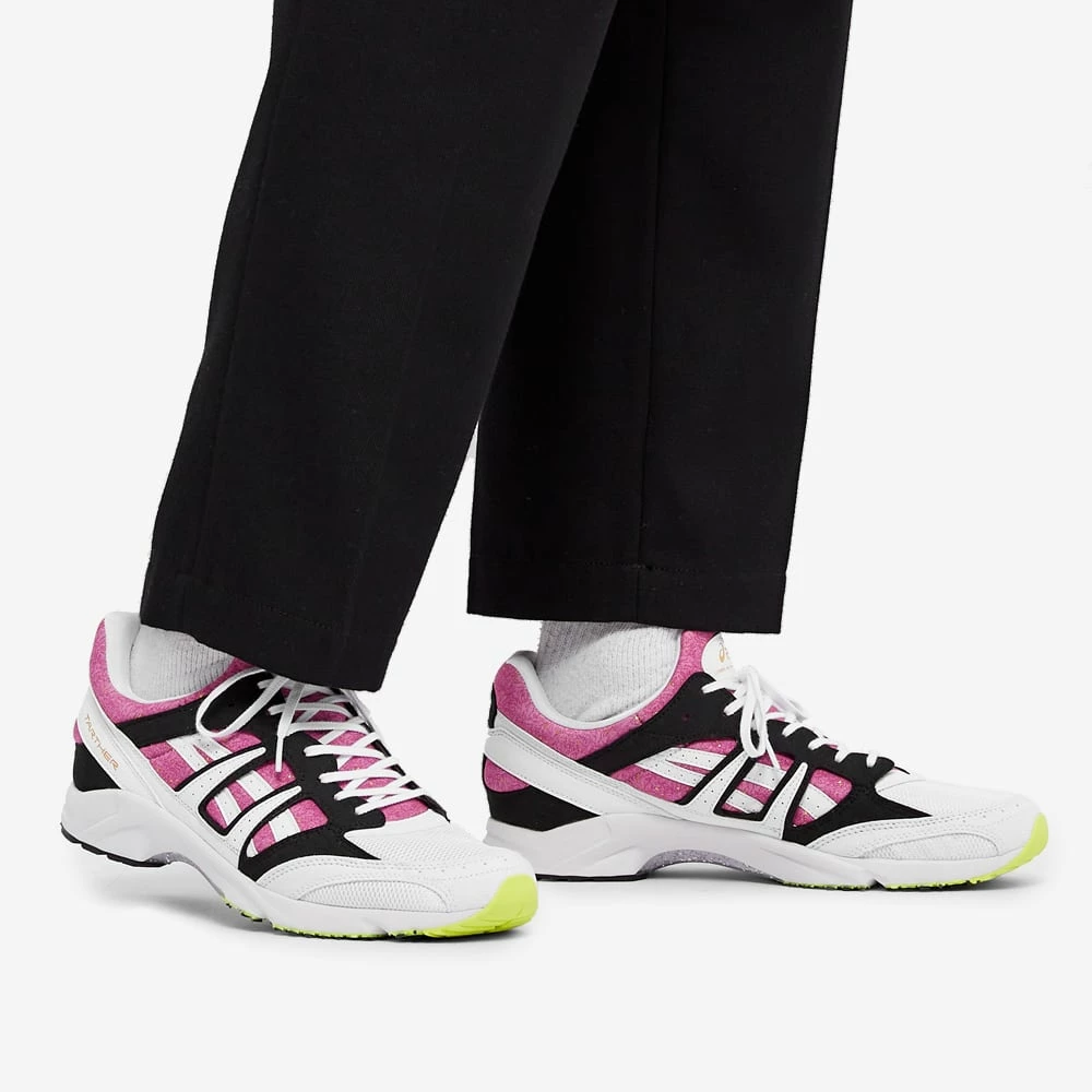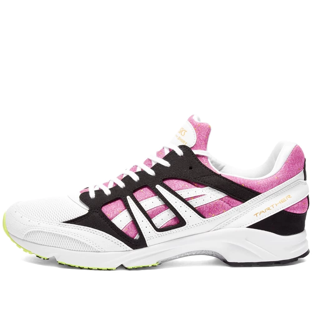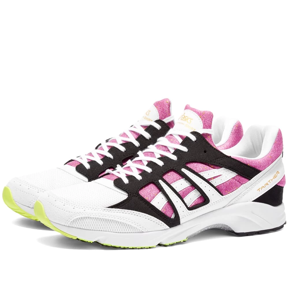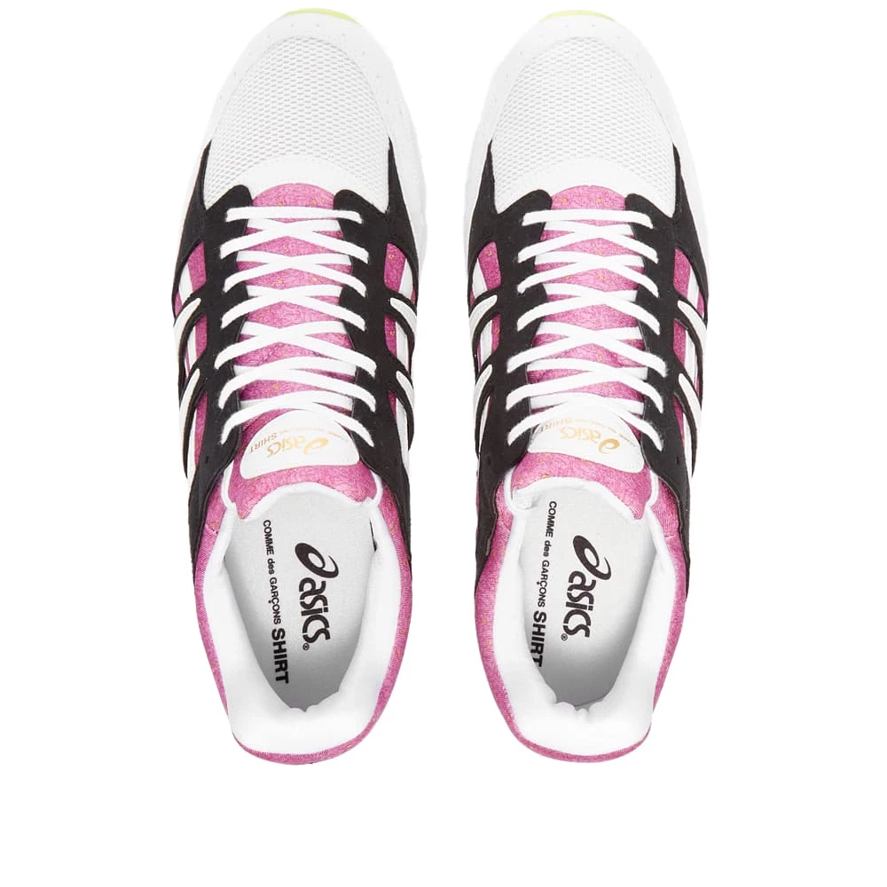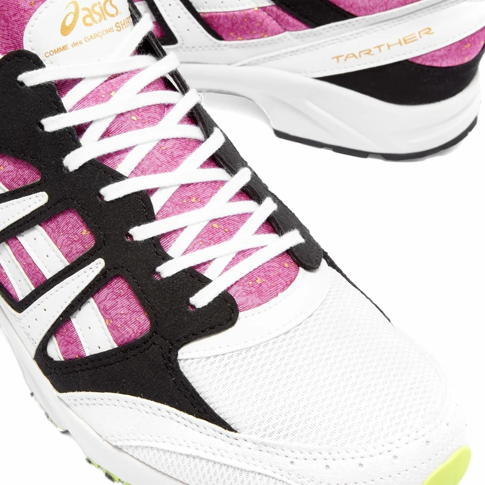 High-fashion opulence and sportswear are combined by ASICS and Comme des Garçons SHIRT to create this Tarther. It’s built with lightweight, mixed-material uppers and supportive overlays, just like many archival running models, but the finishing is all premium. Vibrant pink underlays are detailed with golden flecks, with the same metallic hue used across the branding.