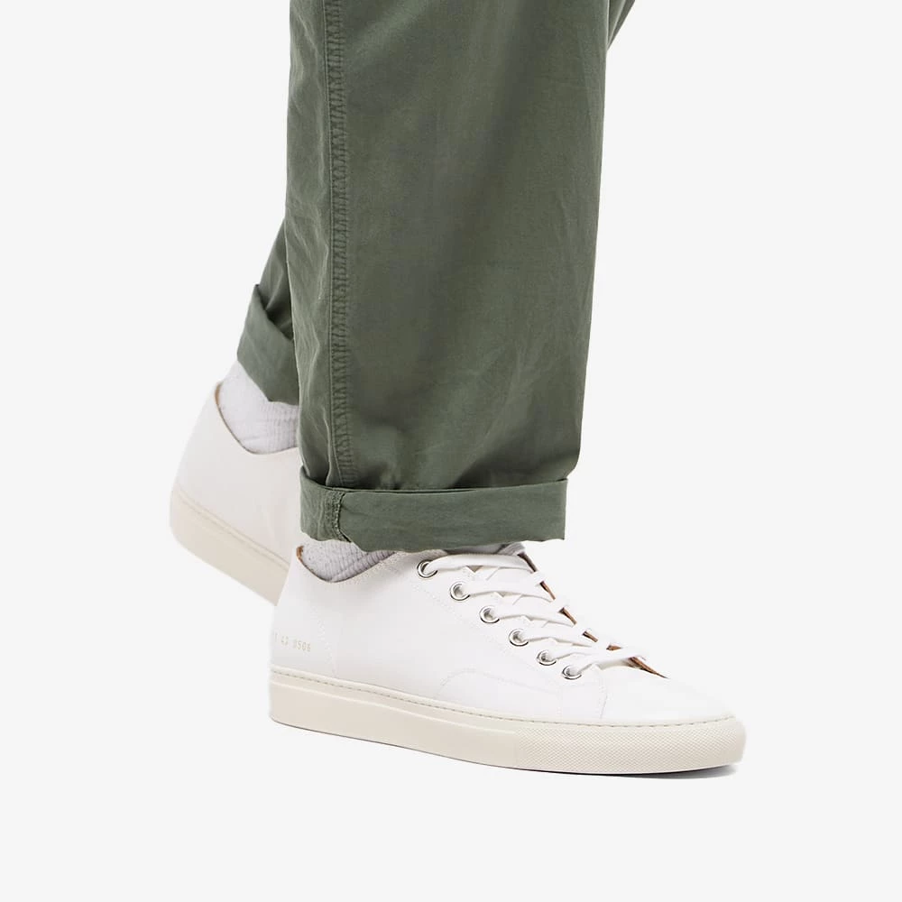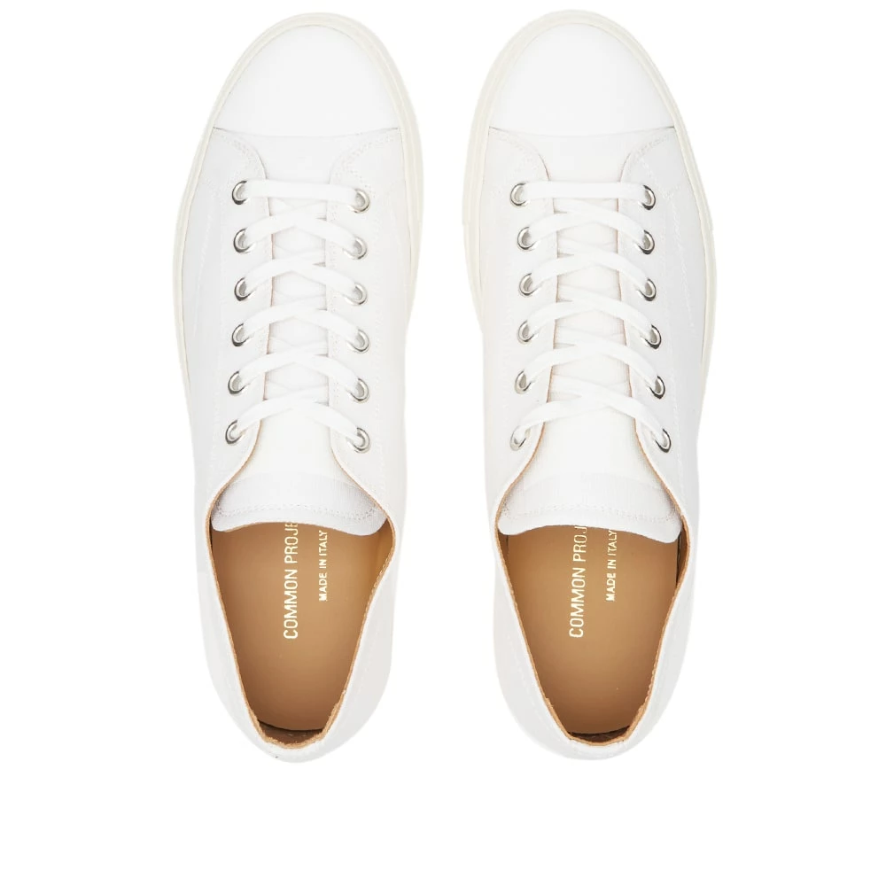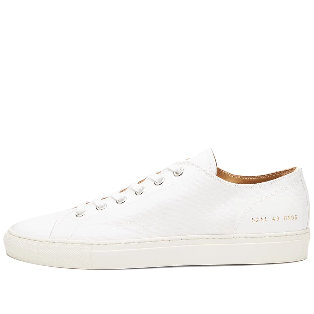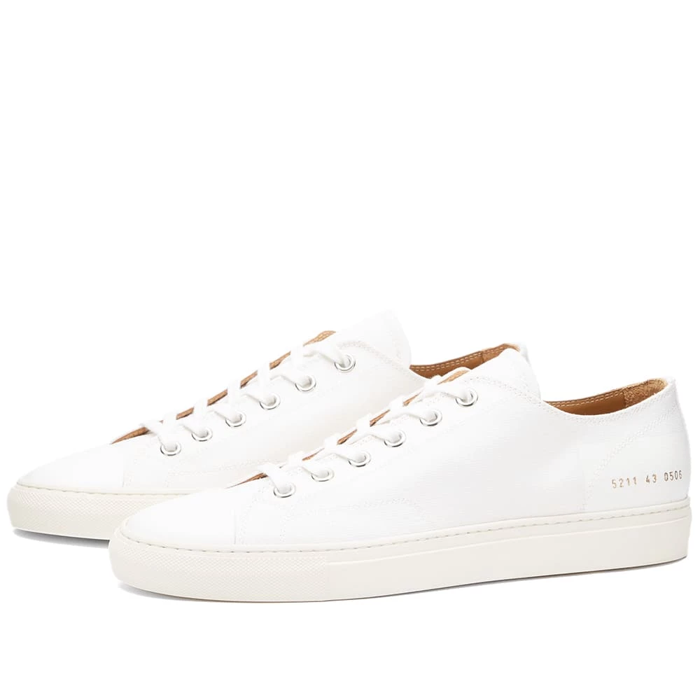 Crafted with cool canvas uppers, these white low-top Tournament sneakers from Common Projects put a premium spin on a classic footwear style. Secured with flat laces, they’re accented with gold-tone branding stamped at the heel and completed with a base of serrated rubber.