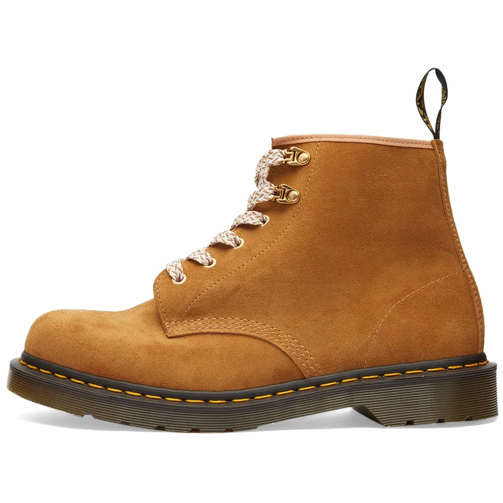 What started off as a simple work boot has transcended into a culture of rebellious self-expression. Dr Martens presents the 101 6-eye boot, packing over six decades of craftsmanship into a sleek and shortened silhouette. Supple suede meets the classic AirWair™ sole and gold-tone eyelets and woven laces add a contemporary touch.