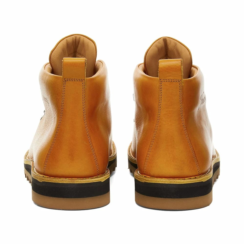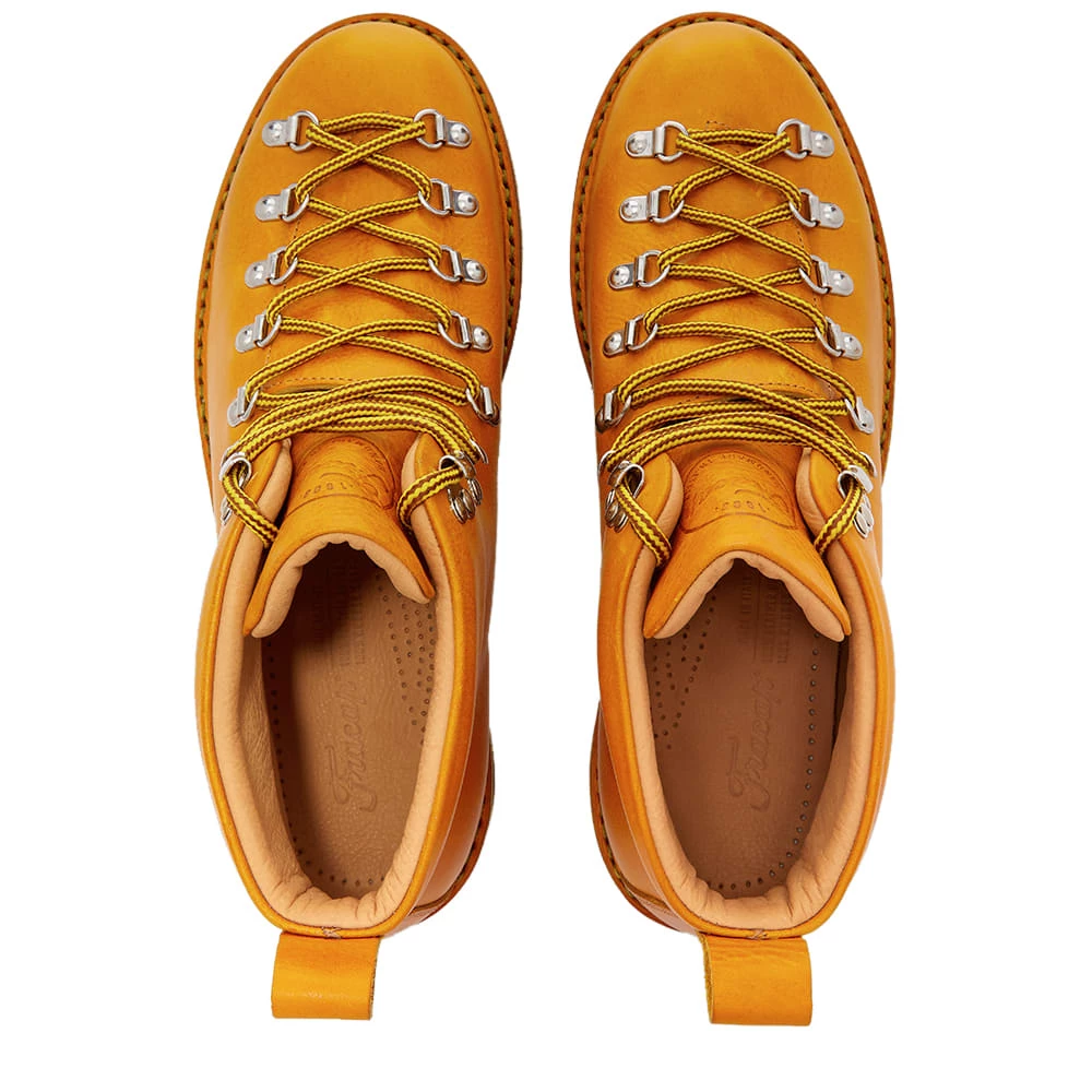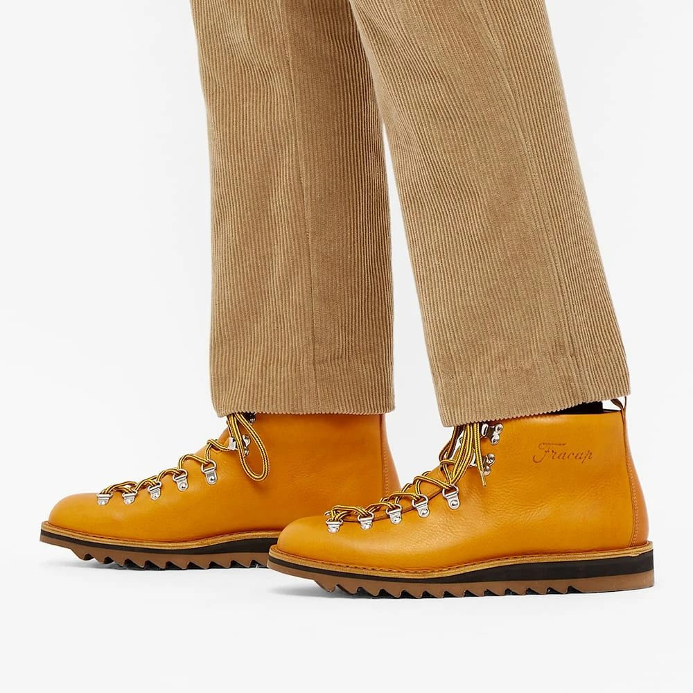 Highly shined mustard uppers with turmeric laces that sit on rubber ripple soles – these boots are unmistakable Fracap. Bringing family values to footwear for over a century, this pair is handmade in the label’s native Italy from lightly grained calf leather. Their rugged hiking style is the ideal accompaniment for your contemporary outdoors edit.