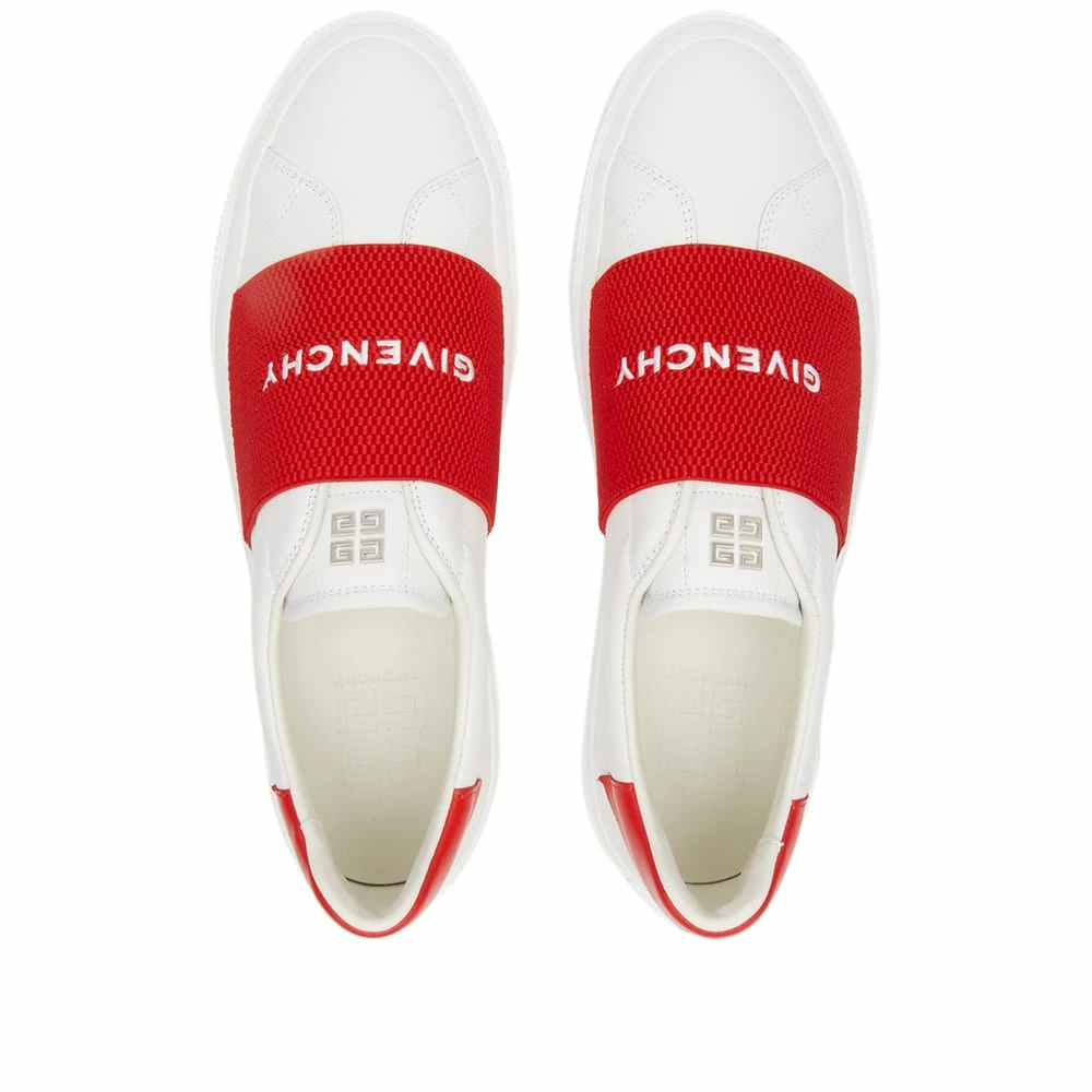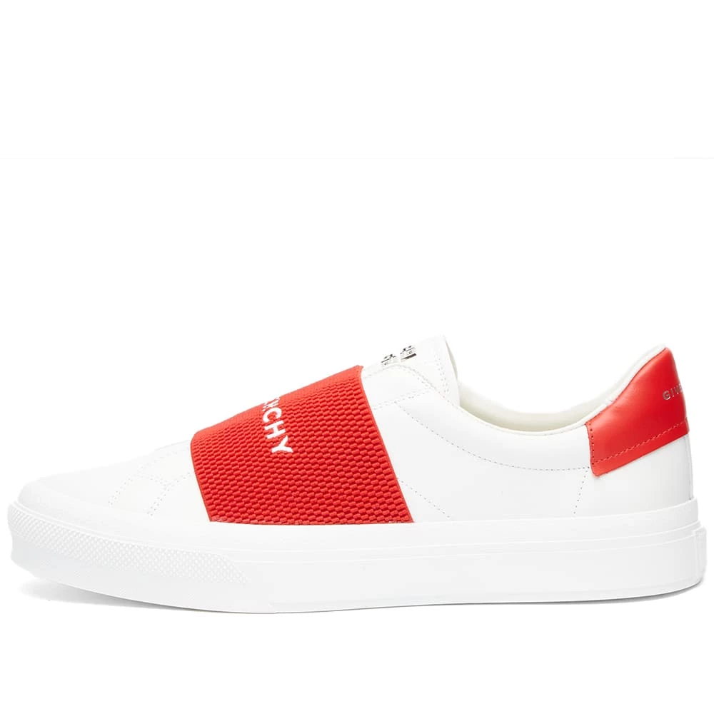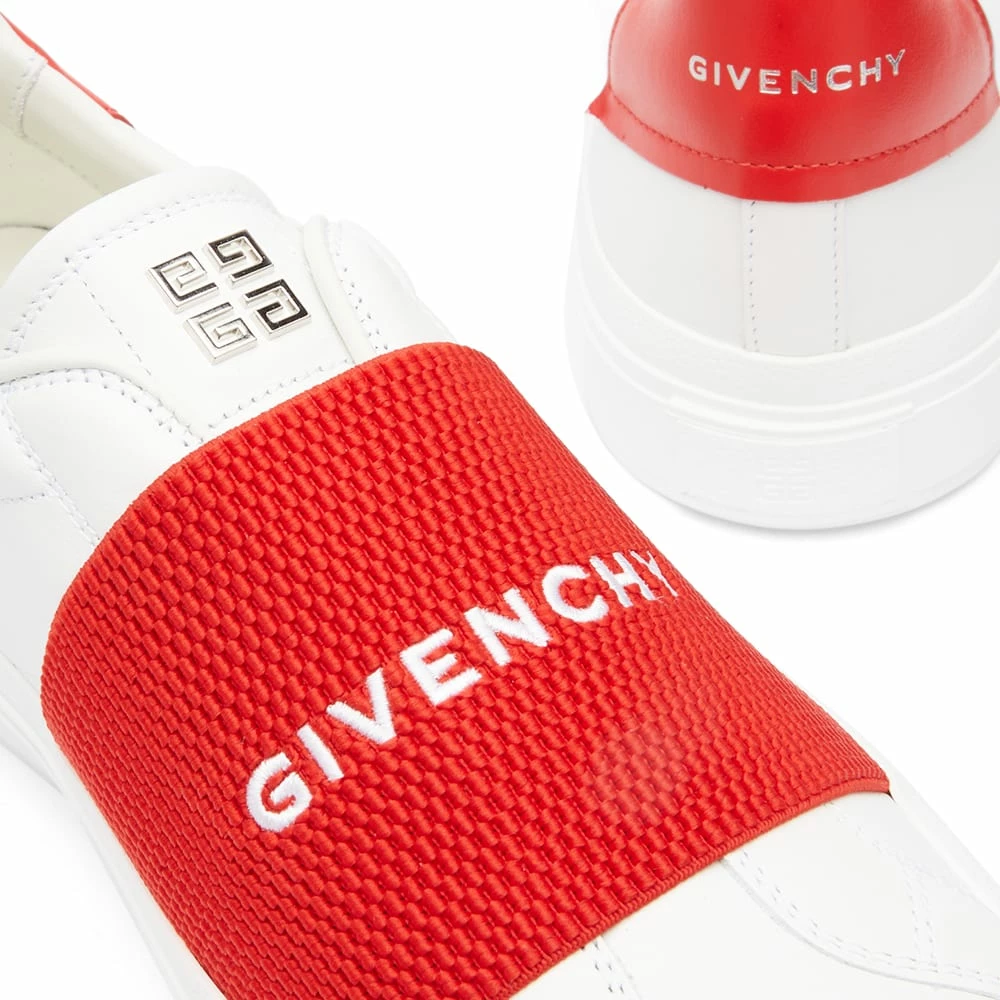Givenchy puts its luxurious spin on the classic tennis sneaker, accenting this crisp white pair with bold red details. Made from smooth calfskin leather, they sit atop tonal rubber soles and feature an elastic band logo across the uppers for a statement finish.