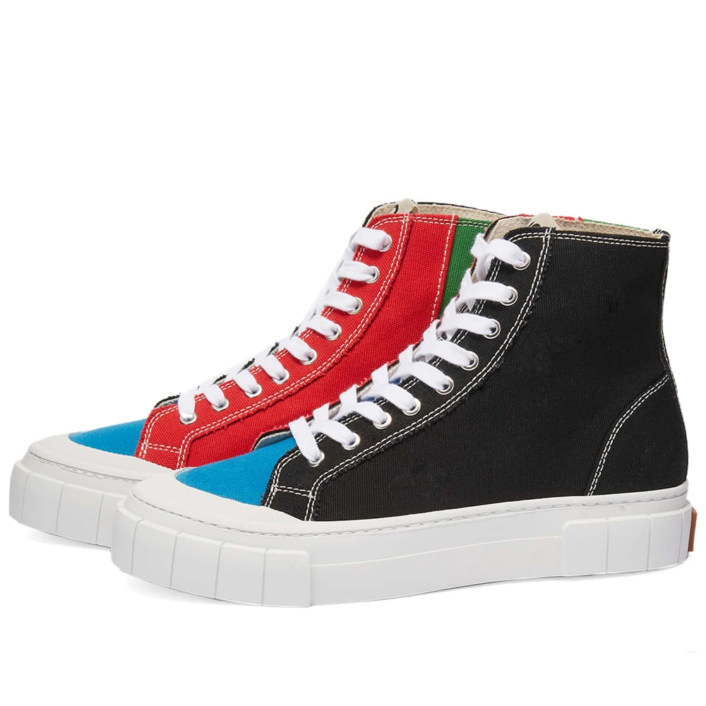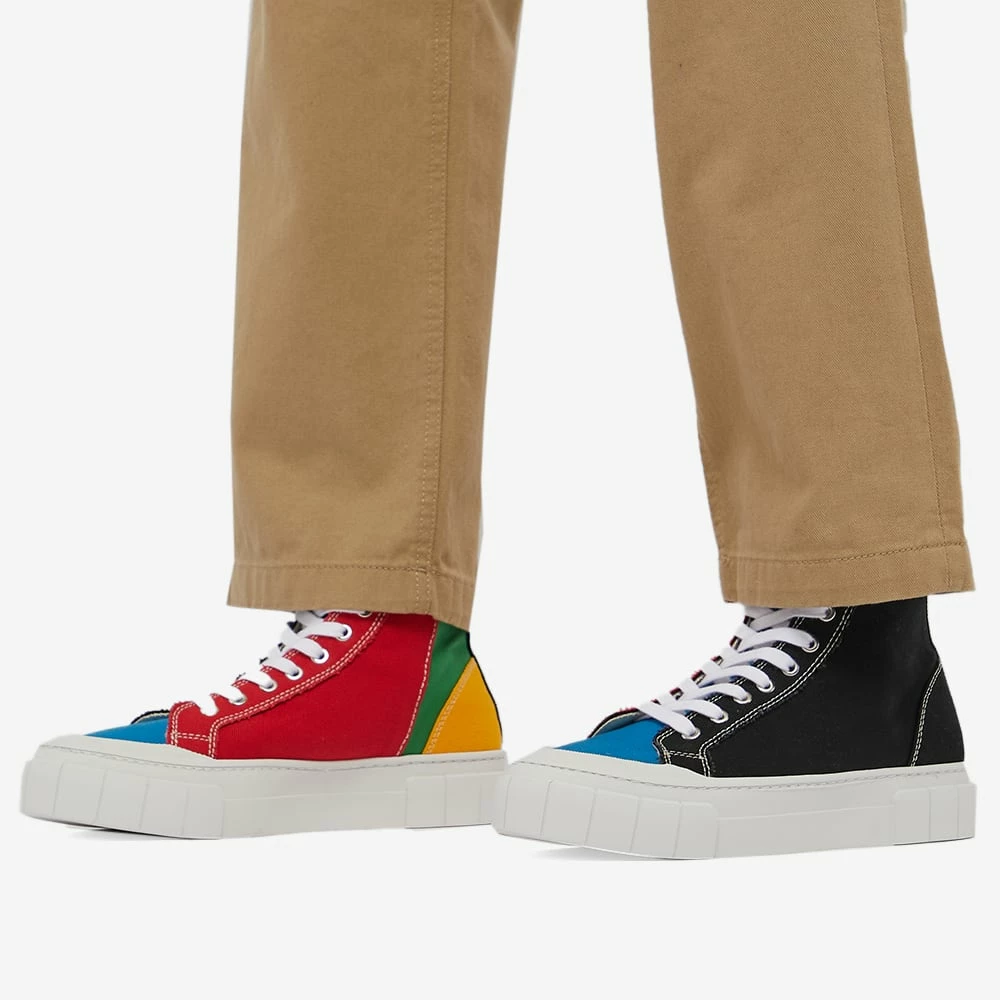 Add a playful touch to your sneaker rotation with this pair of multi-coloured Juice high-tops from London-based label Good News, who know how to put a contemporary spin on sturdy footwear. Inspired by retro American culture and baseball, the signature clean lines and cushioned chunky sole meets bold primary coloured panels, consciously crafted with organic cotton.