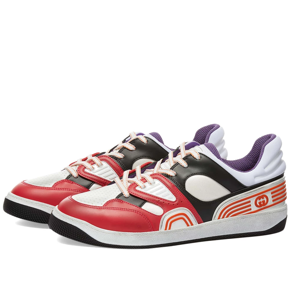 Gucci draws inspiration from classic ‘90s styling to create these sporty low basketball sneakers. Perfect for on or off the court, they’re crafted with white, black and red eco-friendly uppers – that provides resilience and a pliable, smooth finish – and feature retro-inspired orange stripe detailing around the heel. Underfoot, a cushioned white rubber sole signs off the sporty look and guarantees supreme comfort with every stride.