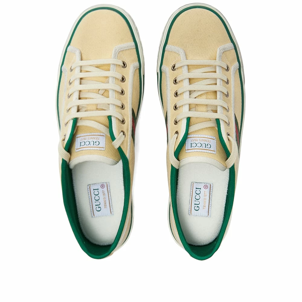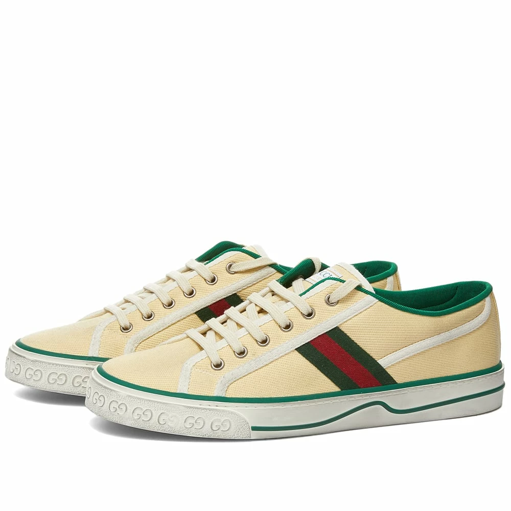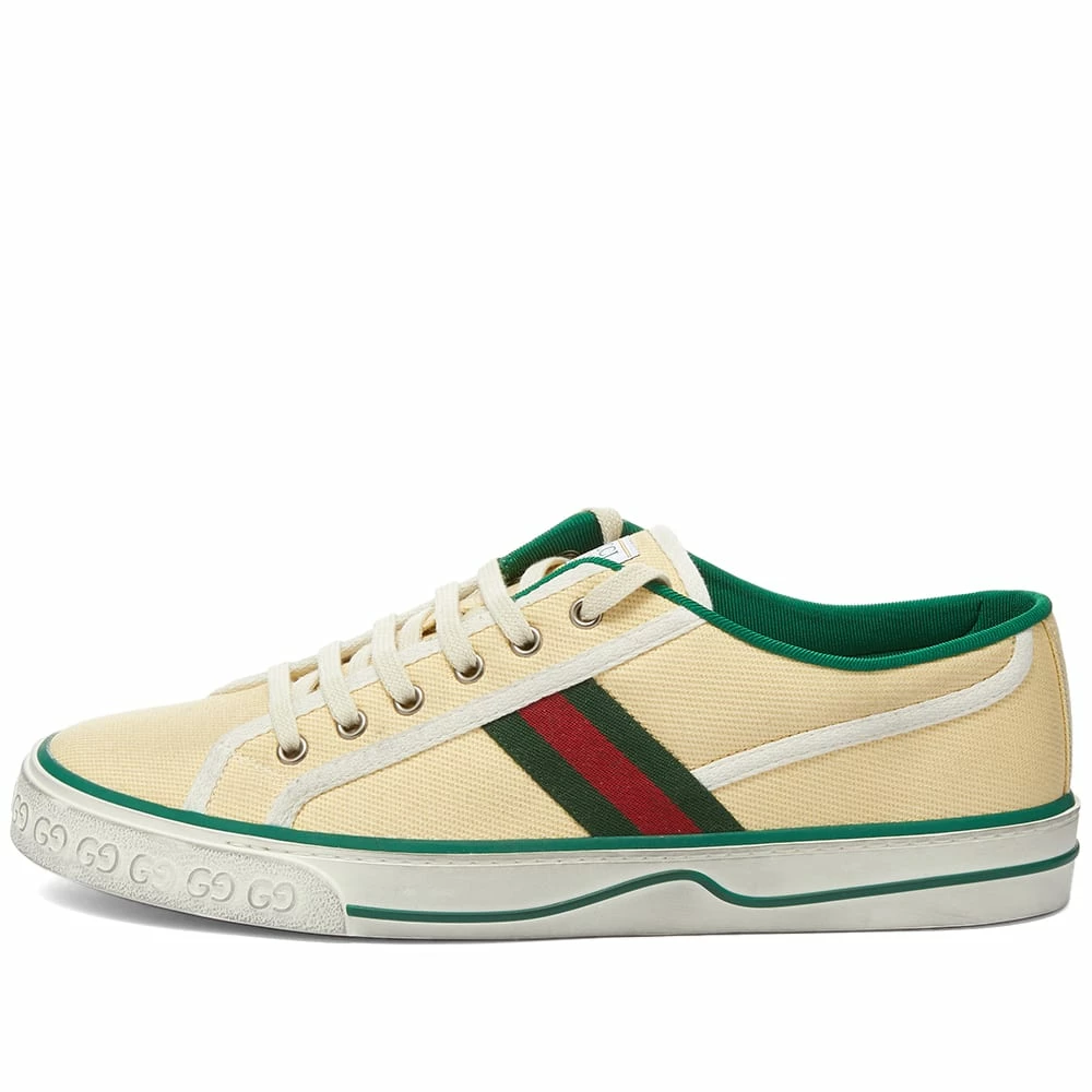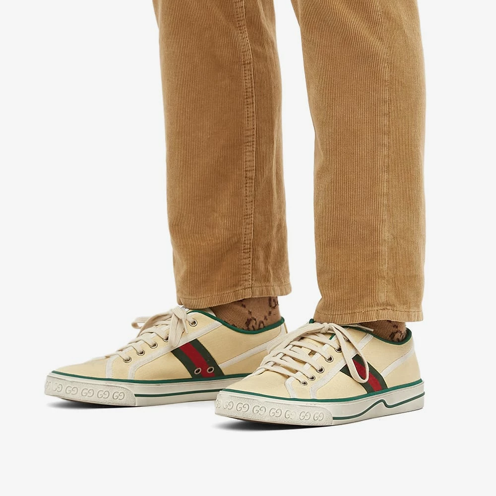 Gucci’s Tennis 1977 sneaker is pulled straight from the brand’s rich archive. Crafted from cream canvas and trimmed with the house Web grosgrain, it’s an authentic, near-exact replica of the classic ‘70s style, and it’s even carefully distressed at the sole to give it that thrift-store-find aesthetic.