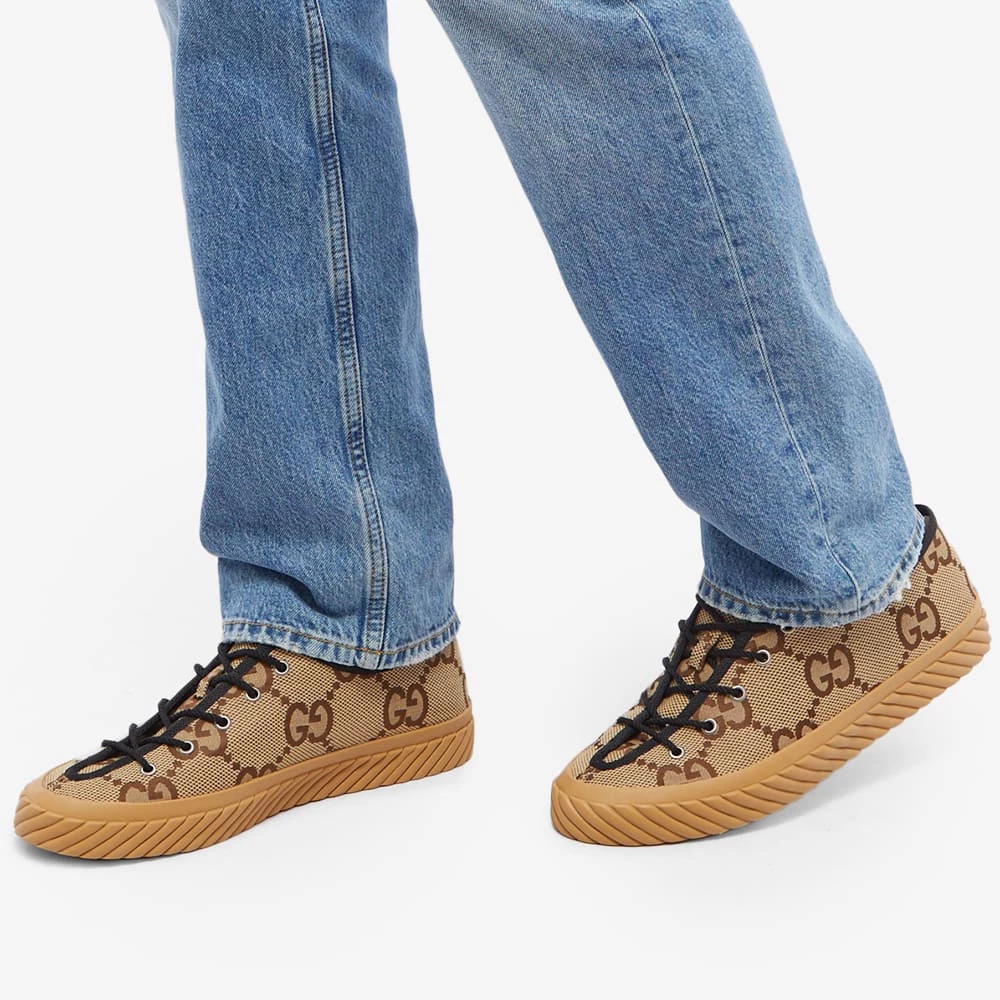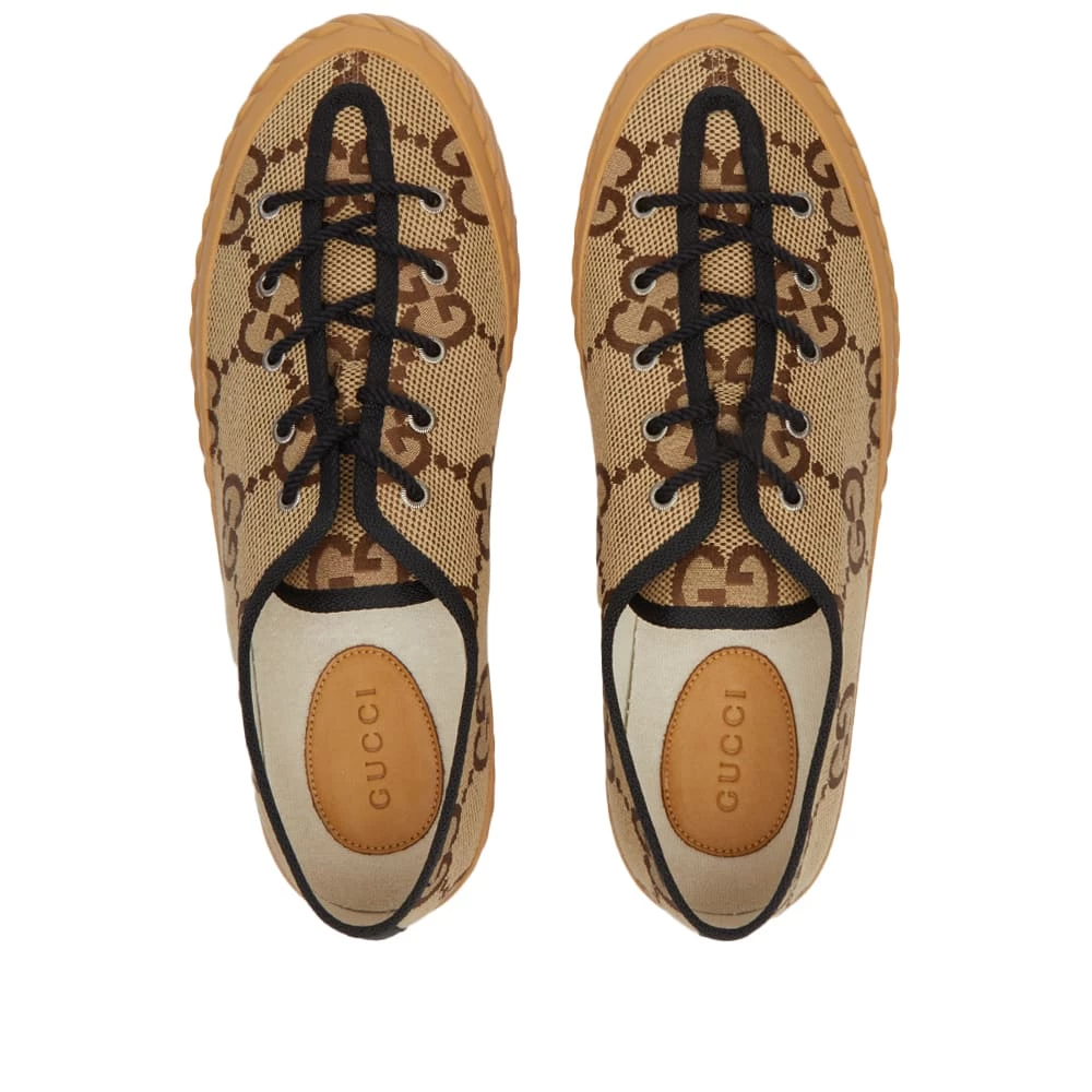 These Gucci Tortuga sneakers pay tribute to both past and present styles, featuring uppers made from camel and ebony canvas and the label’s signature GG design engineered throughout. Perfect for stylish everyday wear, the pair are complete with a black grosgrain trim and chunky rubber sole underfoot.
