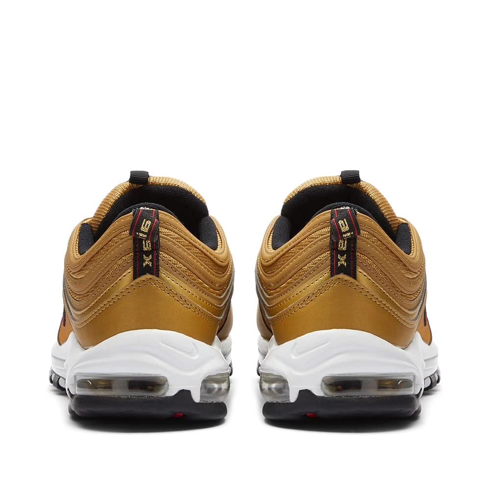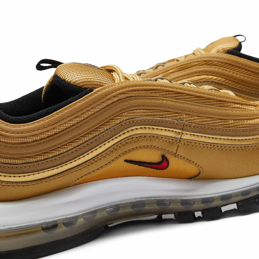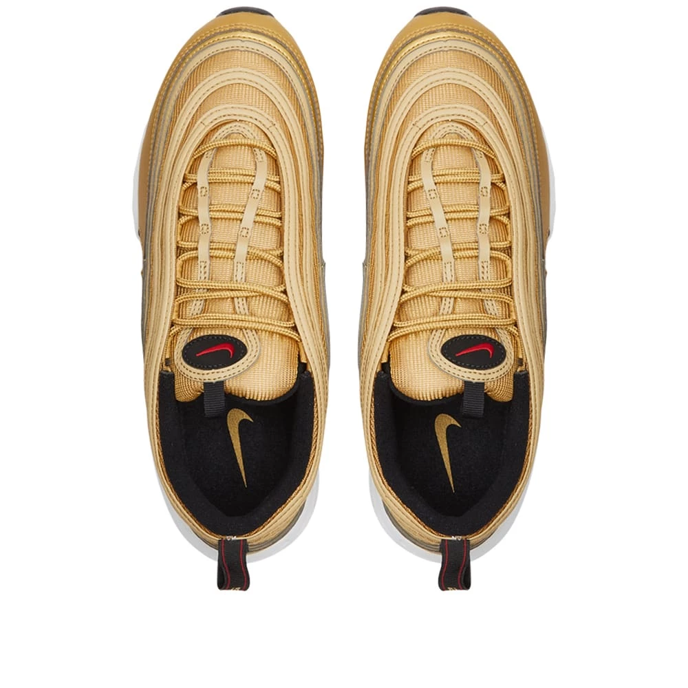 Nike presents the Air Max 97 to celebrate the Christian Tresser designed silhouette’s 25th anniversary. The “Gold Bullet” colourway creates a bold and retro styled sneaker. Made with a layered and stitch-detailed leather upper, the brand’s iconic Swoosh still features embroidered on the side wall. The rubber outsole extends up past the toe to create a sense of movement in the shoe.