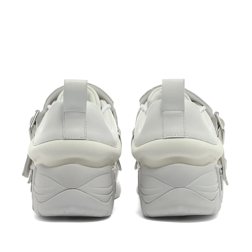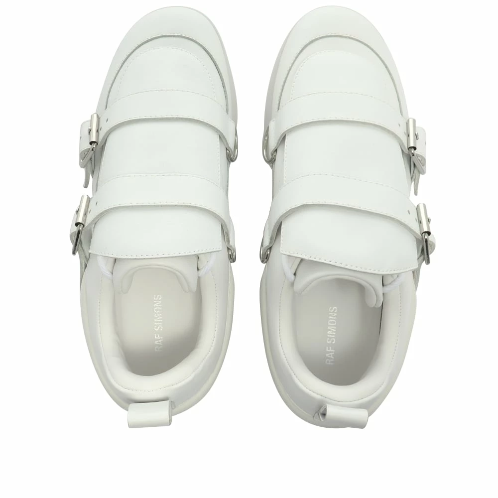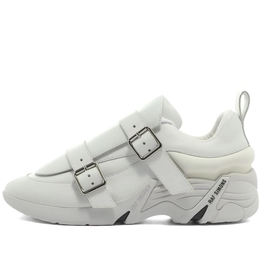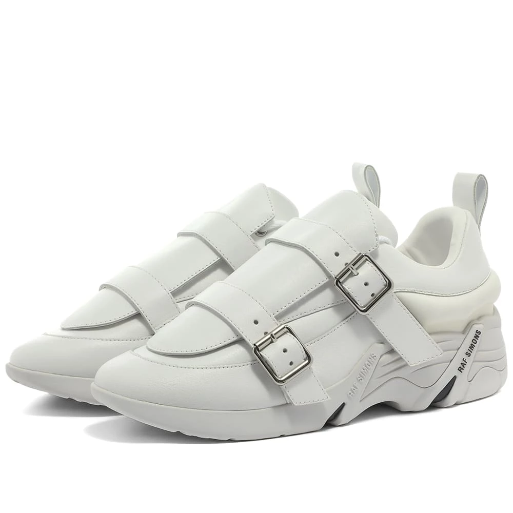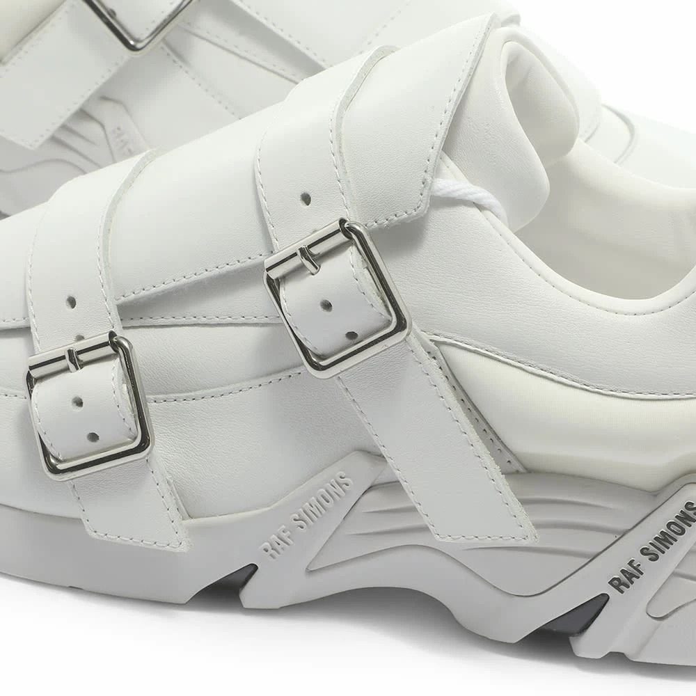 Raf Simons introduces a slick update to the brand’s iconic neo-futuristic sneakers. This version features all-white leather uppers with a leather panel that conceals the laces and gets held in place with silver-toned buckles for a smart, modern touch. They sit atop chunky, tonal lugged rubber soles that are branded with white and black logos for a distinctly modern finish.
