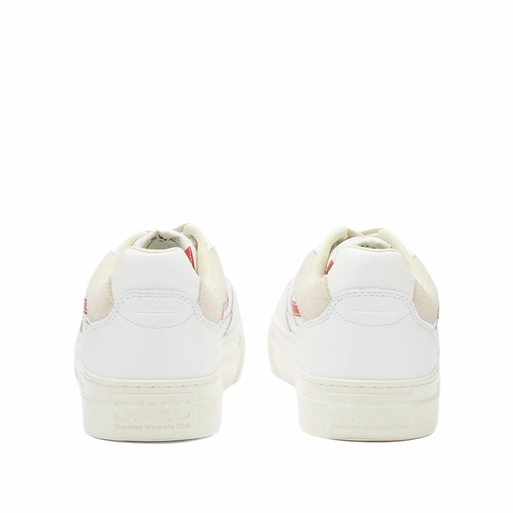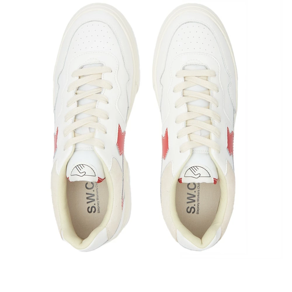 Inspired by traditional workers sports clubs and by bygone era aesthetics, East London label Stepney Workers Club rethinks timeless vulcanised classics. For this rendition of the Pearl S-Strike, it swaps out canvas. The uppers are totally wrapped in white leather, except the muted pink suede panel at the ankle (matching the laces) and the S-Strike in red – printed ‘freedom of thought’ representing values, liberal thinking and unity.
