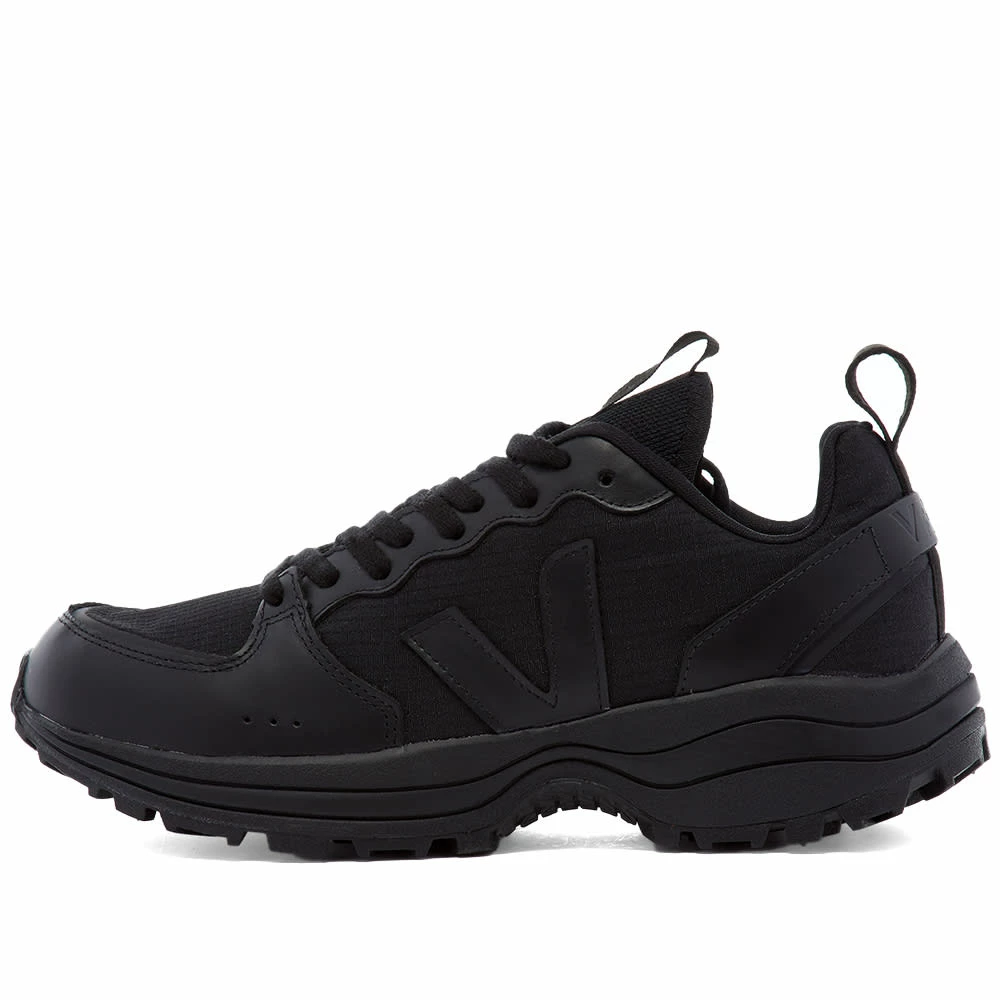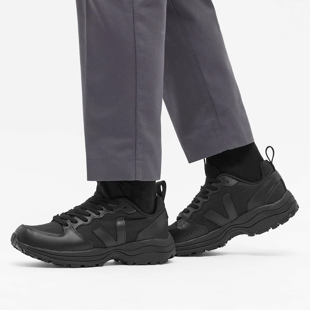 Proudly branded with VEJA lettering stamped at the heel, this triple black Venturi runner is made with uppers of recycled polyester ripstop. Consciously crafted in Brazil with a chunky wild rubber sole, the stealthy sneaker is completed with durable leather overlays.